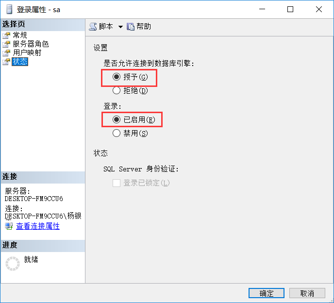 4.完成之后单击安全性——登录名—sa,会显示登录属性,在登录属性中打开状态,看看登录是否正常。