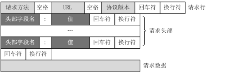 一个完整的HTTP请求报文包括请求行(request line)、请求头部(header)、空行和请求数据四个部分组成。如图所示: