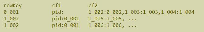 2.在部门表中设计了两个列族 cf1 cf2 在cf2中存储当前部门下的所有子部门;在cf2中存储方式是列名是子部门ID 例值也是子部门ID 例:1_002:1_002
