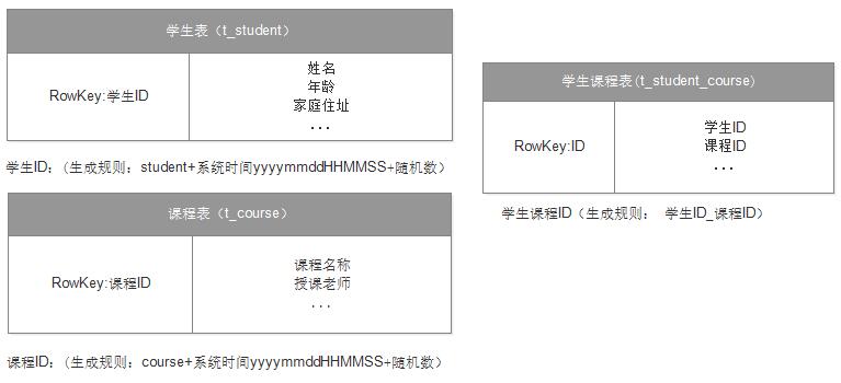 查询某个学生所选的所有课程列表:通过学生ID到学生课程表中去匹配RowKey为studentxxx的记录,然后再根据获取到的记录可以得到课程ID(即RowKey_后的部分);