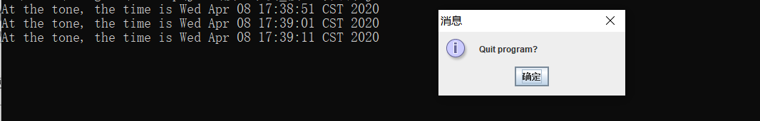 下面的程序给出了定时器和监听器的操作行为。在定时器启动以后,程序将弹出一个消息对话框,并等待用户点击Ok按钮来终止程序的执行。在程序等待用户操作的同时,每隔10秒显示一次当前的时间。