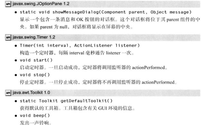 当然,定时器需要知道调用哪一个方法,并要求传递的对象所属的类实现了java.awt.event包的ActionListener接口。下面是这个接口: