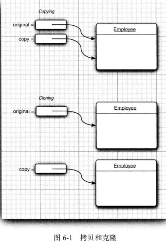 不过,通常子对象都是可变的,必须重新定义clone方法来建立一个深拷贝,同时克隆所有子对象。在这个例子中,hireDay域是一个Date,这是可变的,所以它也需要克隆。(出于这个原因,这个例子使用Date类型的域而不是LocalDate来展示克隆过程。如果hireDay是不可变的LocalDate类的一个实例,就无需我们做任何处理了。)