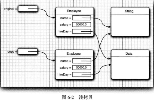 为了更直观地说明这个问题,考虑介绍过的Employee类。下图显示了使用Object类的clone方法克隆这样一个Employee对象会发生什么。可以看到,默认的克隆操作是“浅拷贝”,并没有克隆对象中引用的其他对象。(这个图显示了一个共享的Date对象。出于某种原因(稍后就会解释这个原因),这个例子使用了Employee类的老版本,其中的雇用日期仍用Date表示。)