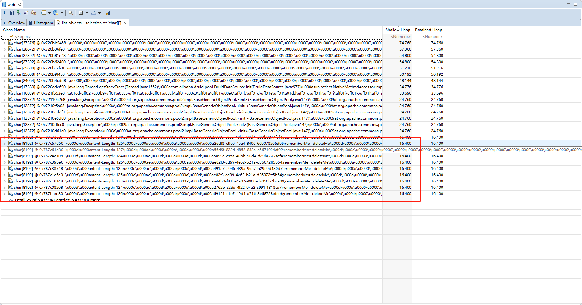 发现不仅user 对象比较多,而且char[] 里面有一个 对象也比较多,带有cookie 和 deleteMe 字段,这个是shiro 框架里面的内容。 我们使用了 shiro 和shiro-redis 作为权限控制框架。 有可能是这两个框架导致的。最后在网上找的果然是shiro-redis 导致的问题