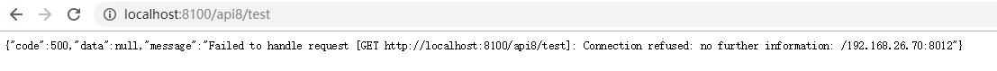 * {"code":500,"data":null,"message":"Failed to handle request [GET http://localhost:8100/api8/test]: Connection refused: no further information: /192.168.26.70:8012"}