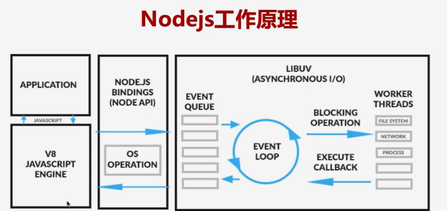 首先自己开发的APPLICATION(自己开发的JS程序)输出给V8引擎,解析后的二进制文件调用NODE API,然后调用LIBUV事件处理库(插入到事件队列,在队列中不断循环处理事件)。
