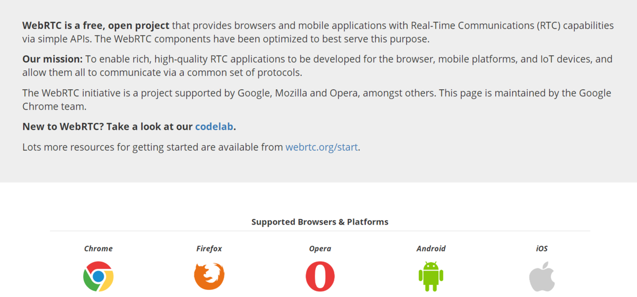 从官网上的描述我们可以知道,WebRTC是一个免费的开放项目,它通过简单的API为浏览器和移动应用程序提供实时通信(RTC)功能。