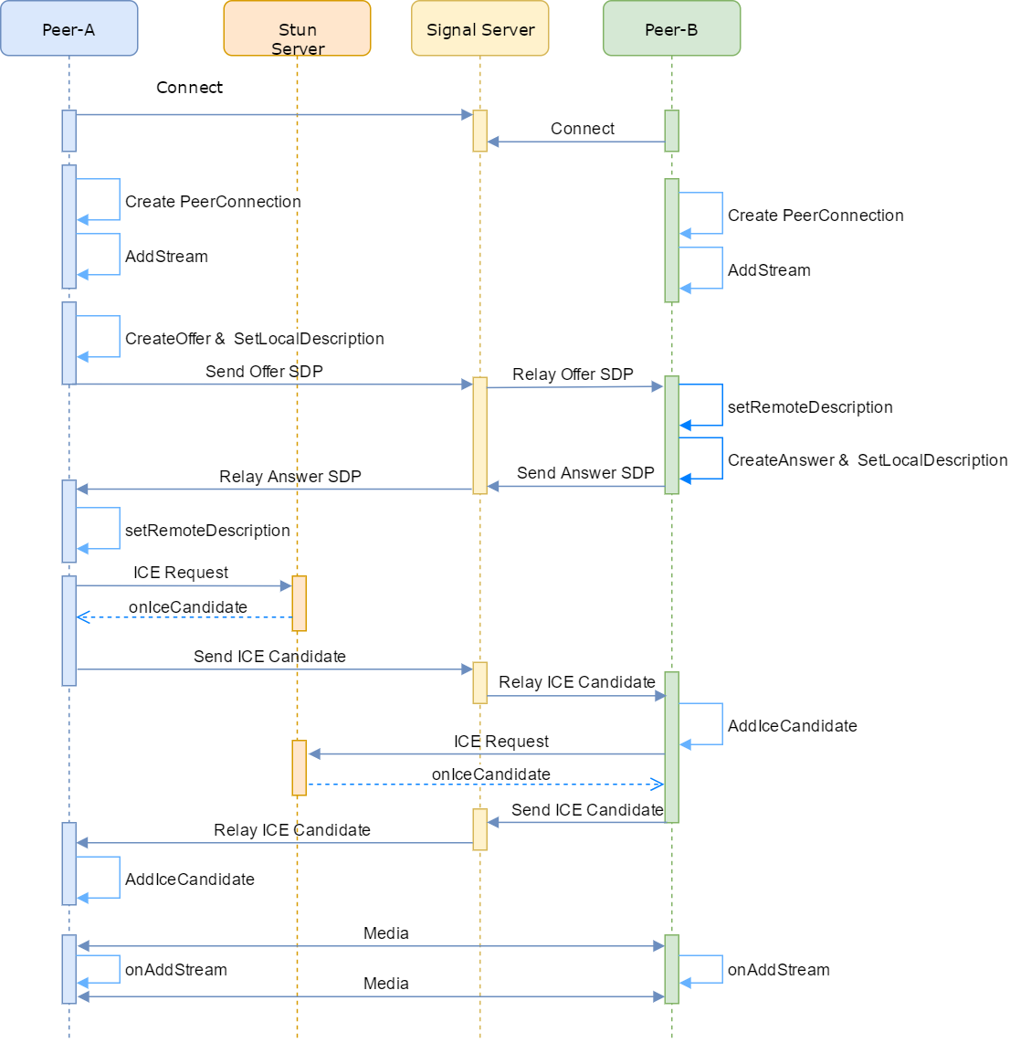 从上面1/2点我们知道了2个客户端协商媒体信息和网络信息,那怎么去交换?是不是需要一个中间商去做交换?所以我们需要一个信令服务器(Signal server)转发彼此的媒体信息和网络信息。