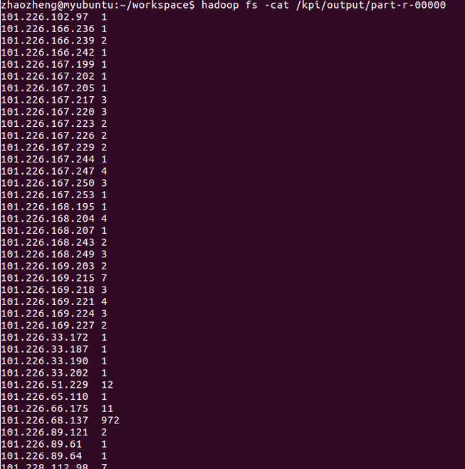public class worldcount extends Mapper<LongWritable,Text,Text,IntWritable>{ //重载Mapper类的map方法 // 这里的key是读取文件的行号,value是对应行号的文本 protected void map(LongWritable key,Text value,Context context) throws IOException, InterruptedException{ //将这一行转化为string String line=value.toString(); //以空格切分 String [] linewords = line.split(" "); //获得ip String ip=linewords[0]; // 所以在context里面写的内容就是 key:ip ,value 是1 context.write(new Text(ip), new IntWritable(1)); } }
