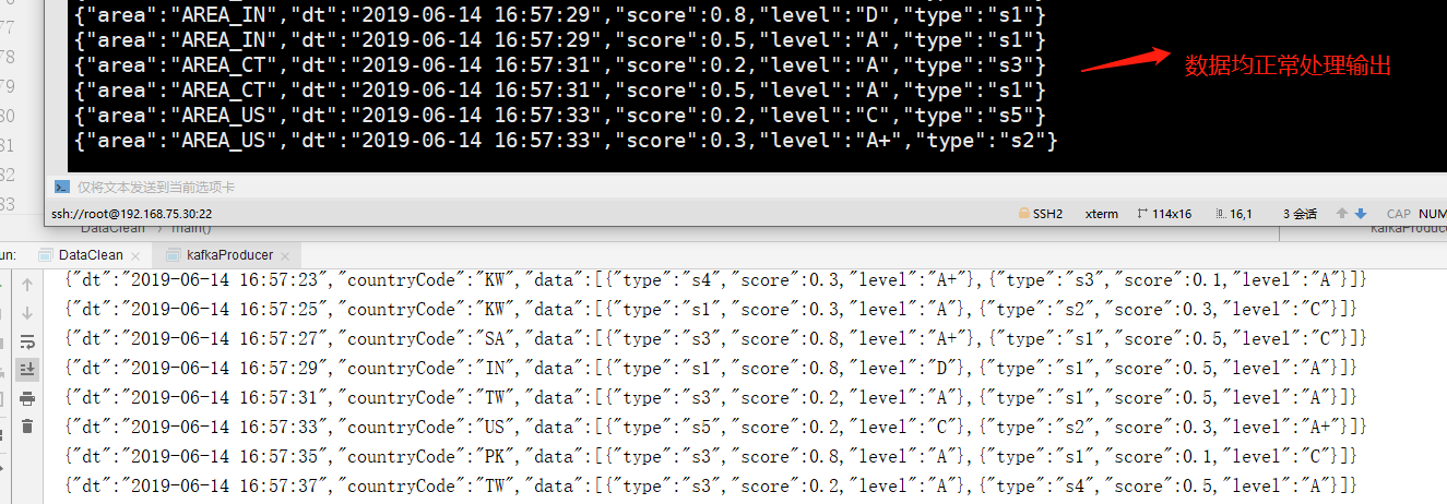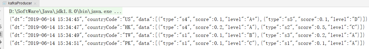先启动 DataClean 程序,再启动生产者程序,kafka生产者产生数据如下: