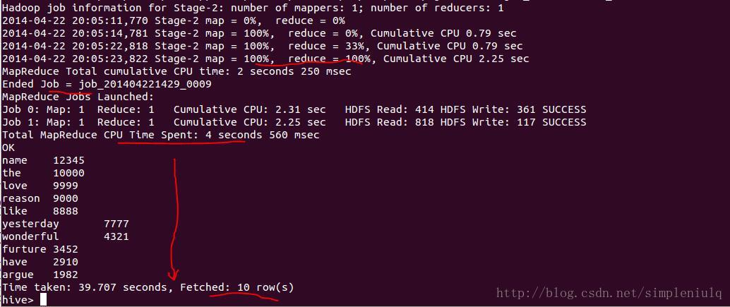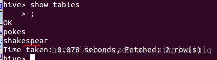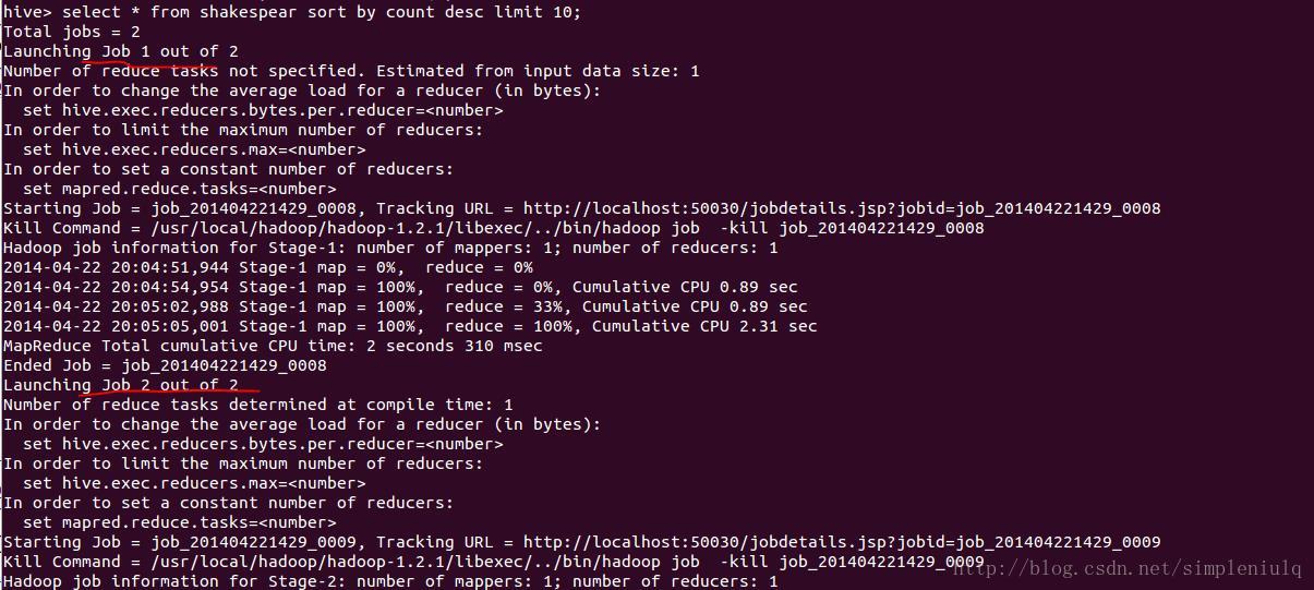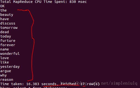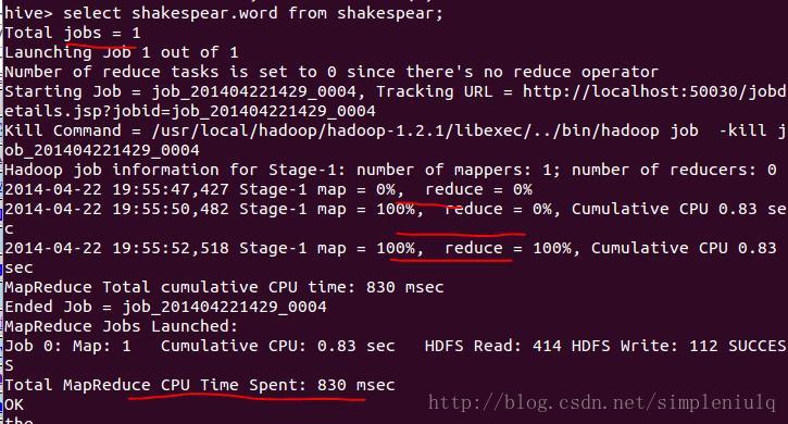 执行selectshakespear.word from shakespear;,将会采用mapreduce执行查询,如下:
