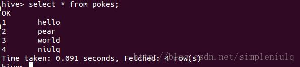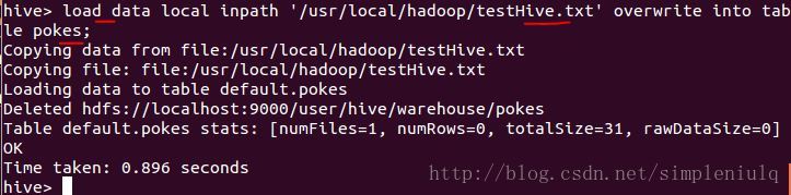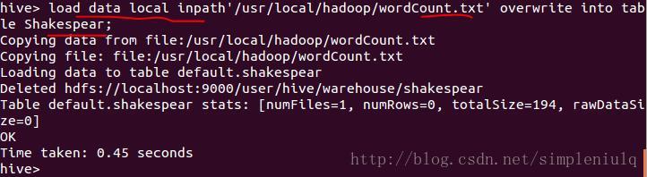 注意:hive不支持用insert语句一条一条的进行插入操作,也不支持update操作。数据是以load的方式加载到建立好的表中。数据一旦导入就不可以修改。