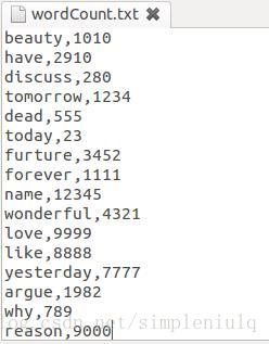 由于是实验,所以自己定义了一个词频统计文件,wordCount.txt,如下格式: