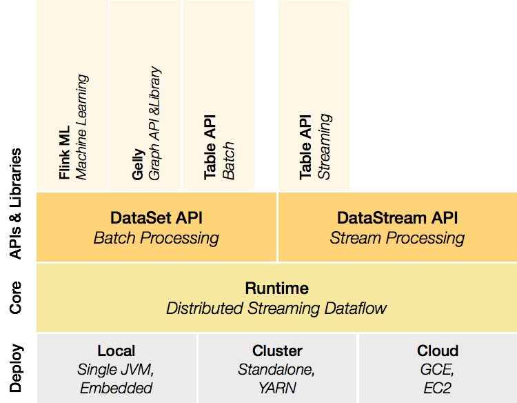 Deploy层:该层主要涉及了Flink的部署模式,Flink支持多种部署模式:本地、集群(Standalone/YARN)、云(GCE/EC2),Standalone 部署模式与Spark类似;
