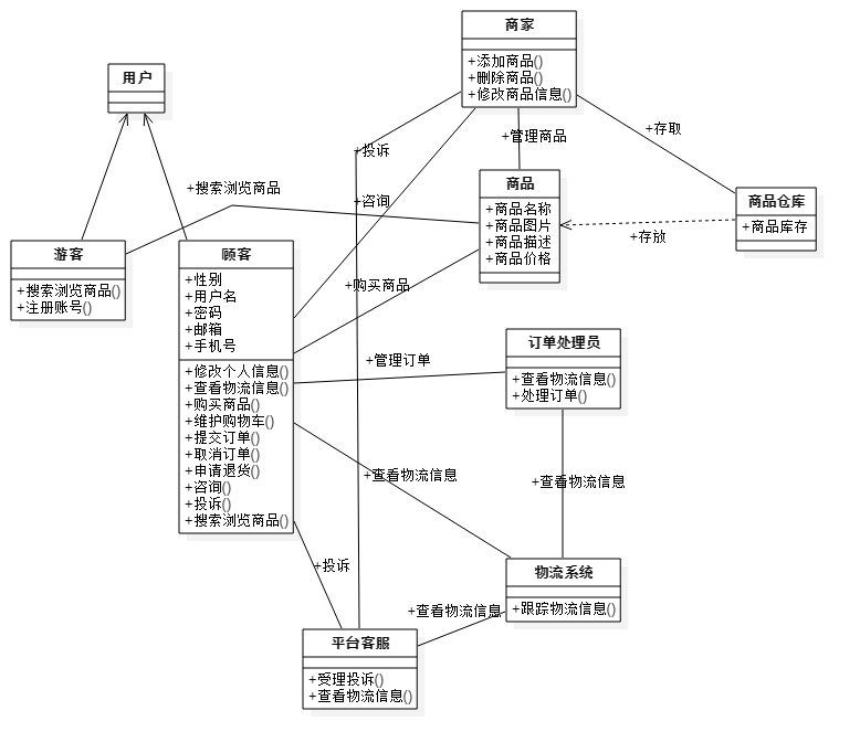 关系说明:商品类与顾客类、商家类以及商品仓库类有关联