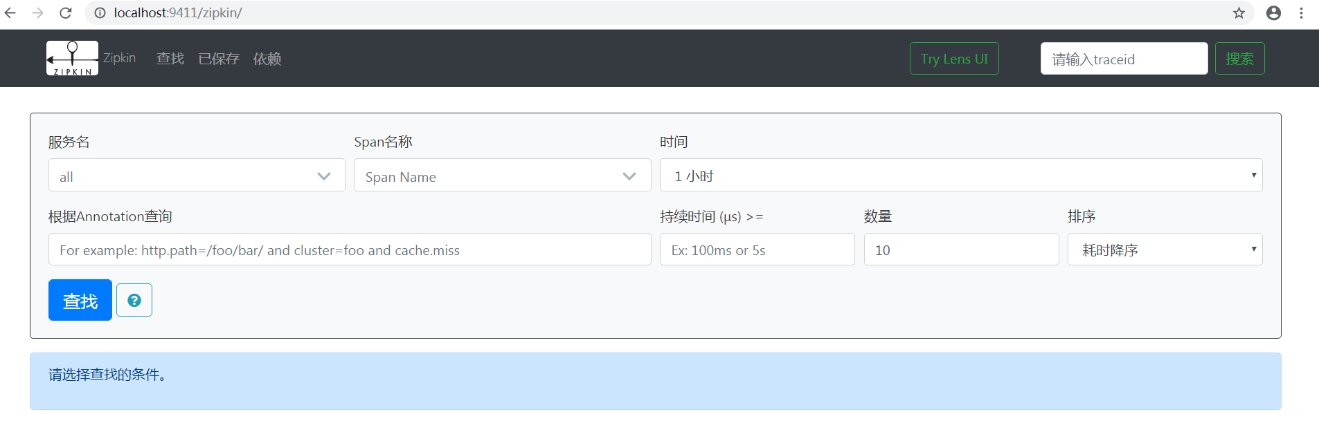 执行完成后,打开地址:http://localhost:9411/zipkin/