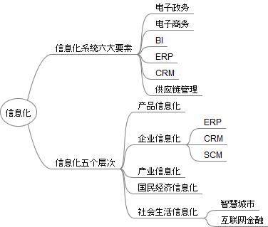 信息化从小到大可以分成五个层次:产品信息化,企业信息化(ERP,CRM,SCM),产业信息化,国民经济信息化,社会生活信息化(智慧城市,互联网金融) (记忆要点:产企业国社)