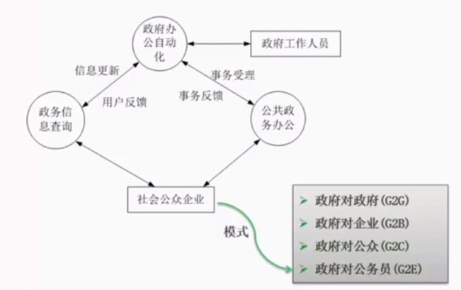 | G2E | 政府对政府公务员 | 政府部门内部的办公自动化,政府与公务员之间的互动。 | 电子政策法规,电子公文流转,电子办公,电子培训,电子财经管理,公务员业绩评价。政府的系统给内部人员使用。 |