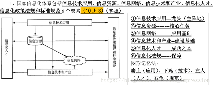 国家信息化六要素:信息资源,信息网络,信息技术应用,信息产业,信息化人才,以及信息化政策法规,标准和规范。(关键字:资网技术产人政)