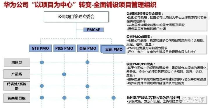华为在实施向以项目为中心转变的初期,就明确了必须在公司层面设立了项目管理专委会,同时成立PMCoE作为公司级PMO,并明确每个岗位的职责、权限。