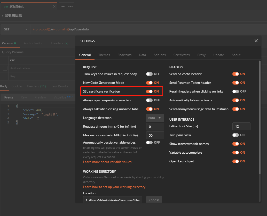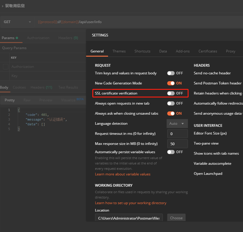 新下载了一个postman,试了试接口,突然请求接口失败,还以为是程序出问题,但排查后,发现不是程序问题,最终找到解决问题的地方,话不多说,直接上图。