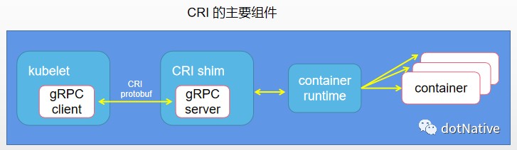 kubelet 使用 gRPC 框架通过 UNIX Socket 与容器运行时(或CRl代理)进行通信。在这个过程中 kubelet 是客户端,CRI 代理(shim)是服务端,如下图所示。