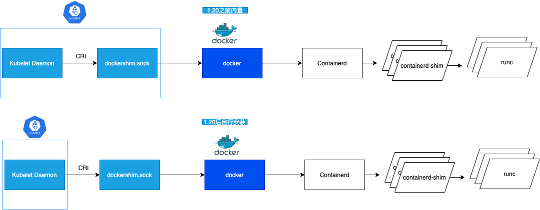 Kubernetes 1.20前后,对于docker的支持没有变化,只是将该部分代码(dockershim)独立出来,使用者可独立配置。