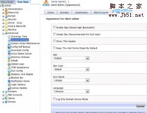 4、访问http://你的IP:7778/ 进行kloxo后台,在Advanced->General Settings->Appearance下的Language里选择Chinese,然后点击update确认,这时会自动刷新,界面已经是中文的了。图片如下: