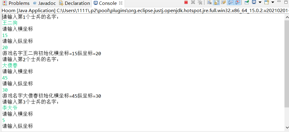 1.创建士兵类(Soldiers),在该类中定义有参构造方法,该方法有一个String类型参数name,代表土兵的姓名,两个int类型的变量x和y,分别表示土兵被实例化后所在的坐标位置,X代表横坐标,y代表纵坐标。在主方法中使用for循环创建5个土兵对象,每个士兵对象的姓名以及x、y坐标是通过用户在控制台输入的。