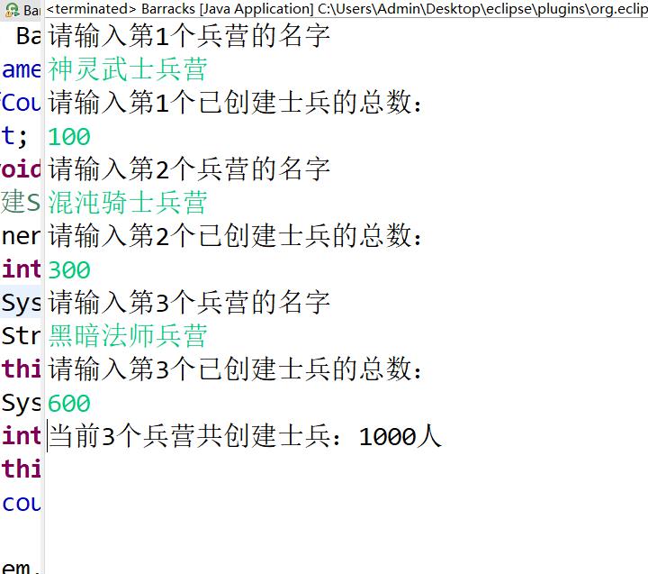 System.out.println("当前3个兵营共创建士兵:"+count+"人");