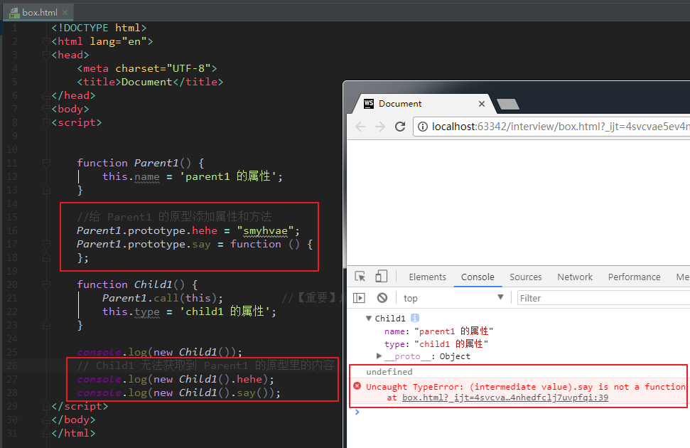 【重要】上方代码中,最重要的那行代码:在子类的构造函数里写了Parent1.call(this);,意思是:让Parent的构造函数在child的构造函数中执行。发生的变化是:改变this的指向,parent的实例 –> 改为指向child的实例。导致 parent的实例的属性挂在到了child的实例上,这就实现了继承。