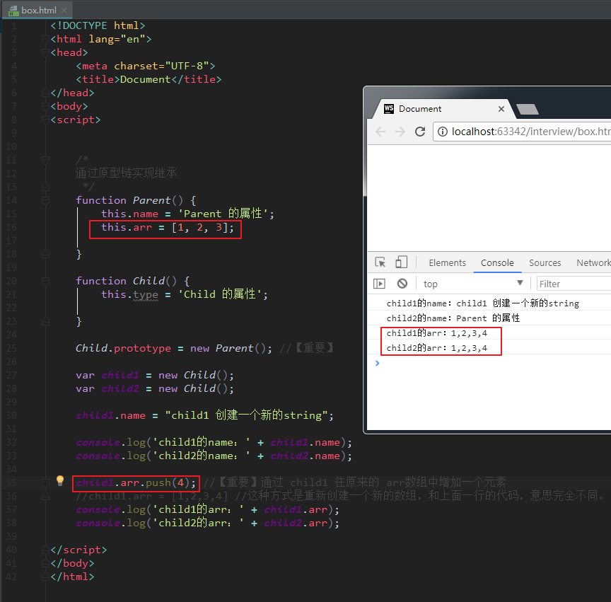 造成这种缺点的原因是:child1和child2共用原型。即:chi1d1.__proto__ === child2__proto__是严格相同。而 arr方法是在 Parent 的实例上(即 Child实例的原型)的。
