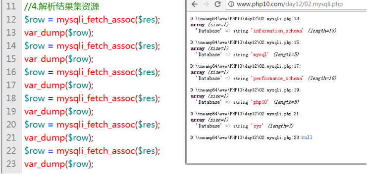注意:结果集资源在解析时,会每次获取一条数据存储成数组的形式返回,当返回这条数据后,数据库中数据指针下移,一直到没有返回false;