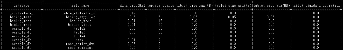 当集群中数据库和数据表都比较多时,使用show data或者show tablet语句来巡检就不那么方便了。这里就给大家提供一个巡检工具(点前面蓝色字体下载分享中的:starrocks-tablet-tool.tar.gz),可以用来统计集群中的表大小、replica个数(tablet数*副本数)、表tablet体积最大、最小、平均值以及标准差,也能方便我们定位是否有数据倾斜问题。此外,工具也支持将统计的结果导出为标准的CSV文件,方便我们后续使用Excel等工具再进行分析。
