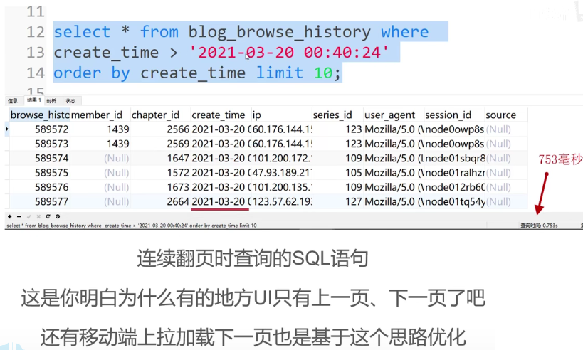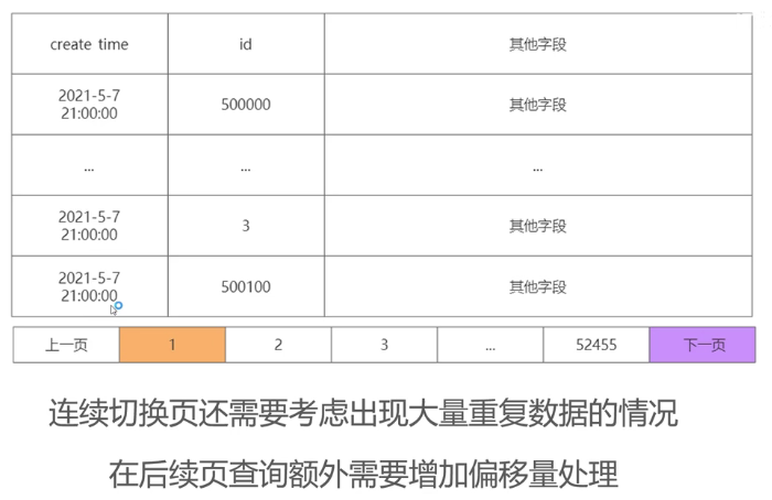 一般用户点击下一页,用他当前页最后一条数据的时间作为条件,查询。即,当用户点击下一页,前端传时间过来。