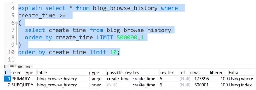现在想看第50000页,一般sql语句如下,但很慢,create_time索引也没用上,type是all,依然全表扫描。因为没有where条件。