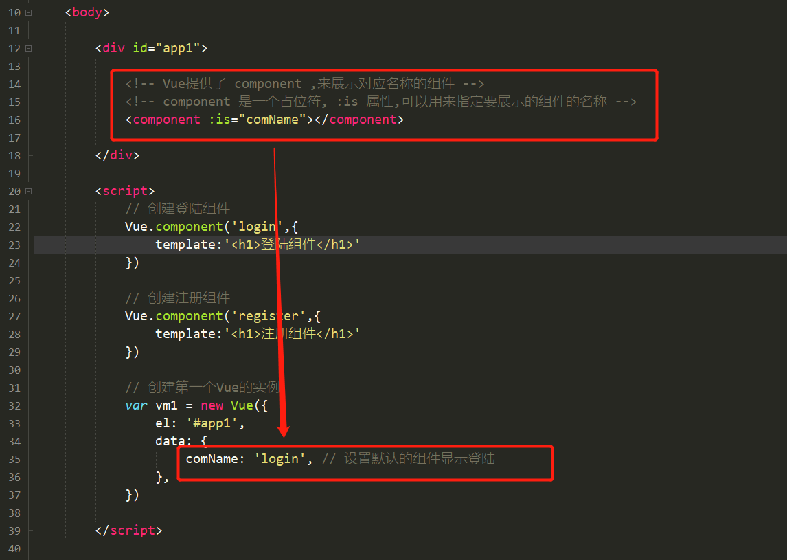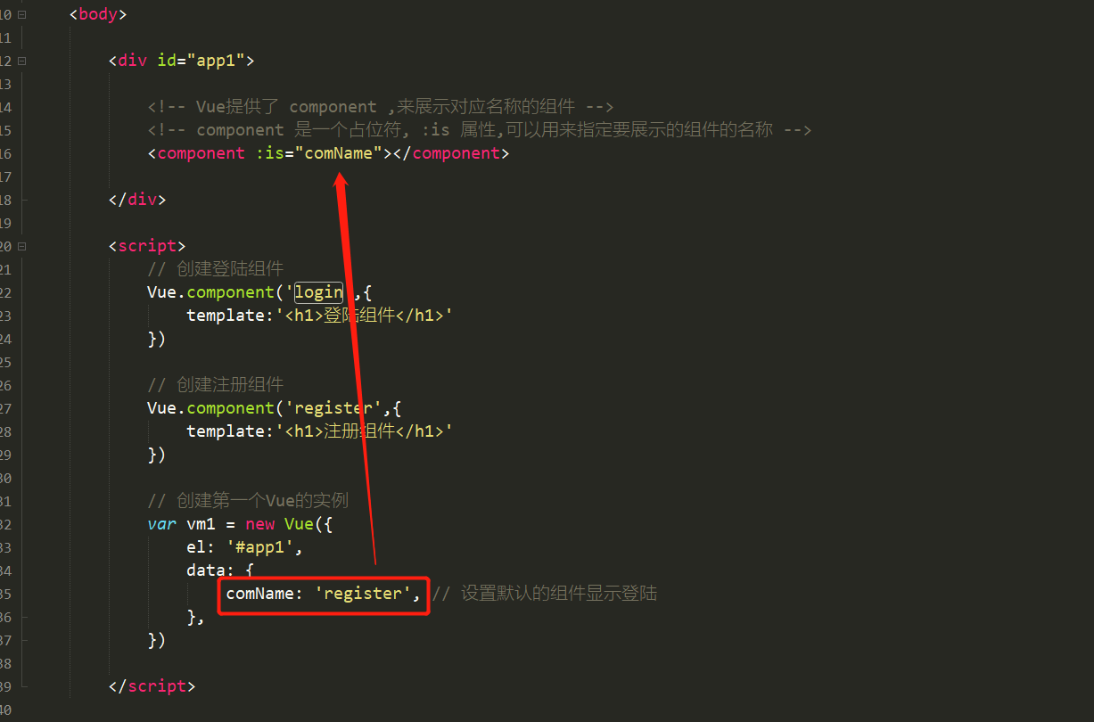 v-if和v-else结合一个flag属性值来控制组件之间的切换。本章节使用components元素来更加直接的切换组件。<!-- Vue提供了 component ,来展示对应名称的组件 -->