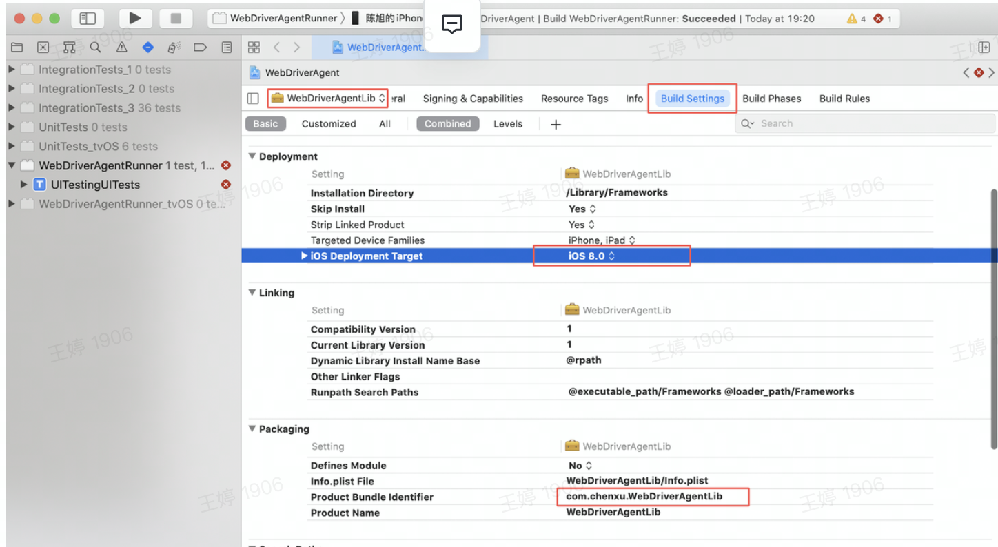 第三步 修改 WebDriverAgentLib文件的 Build Settings 设置支持的最低iOS版本,以及修改 Bundle identifier