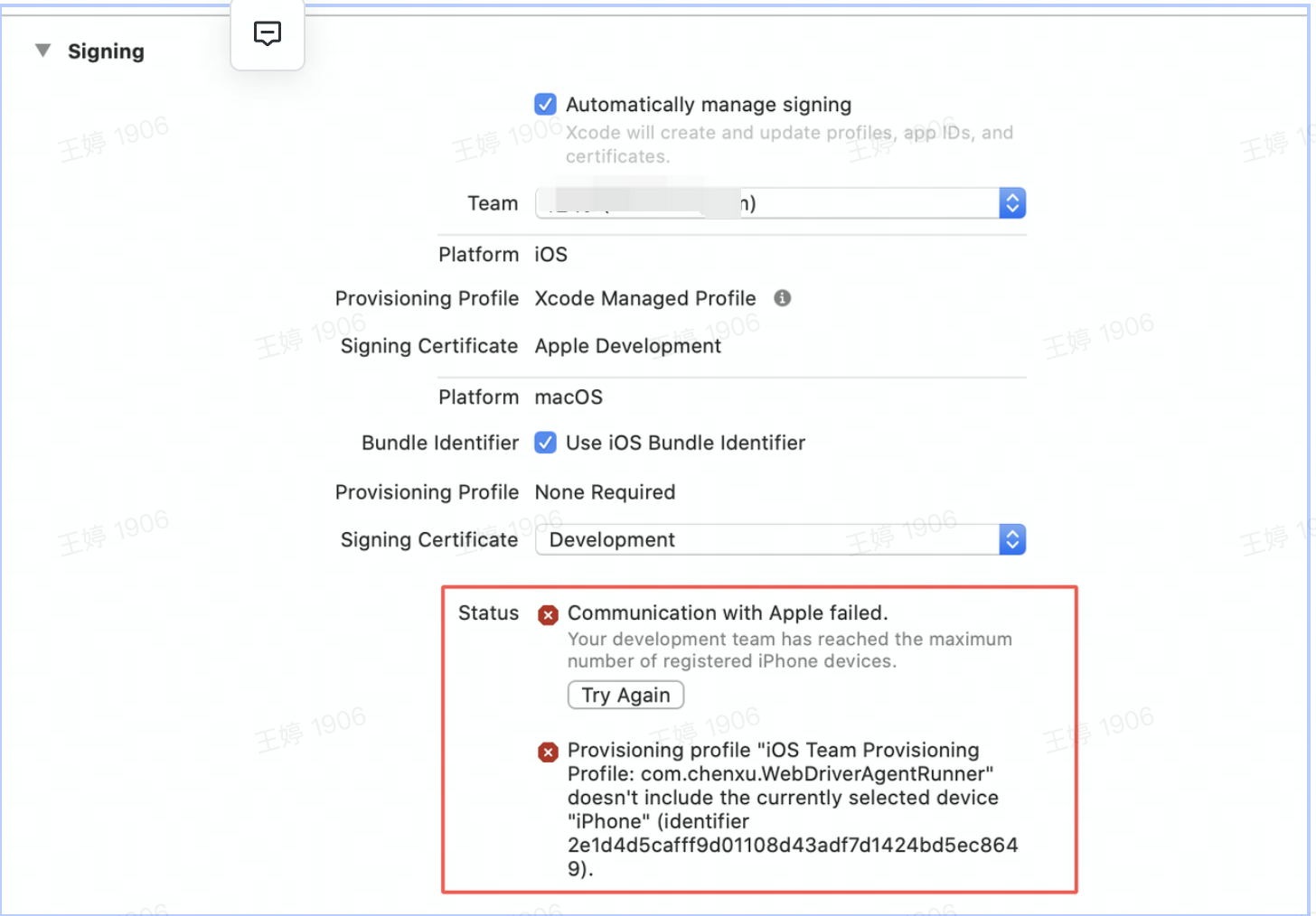 执行后,必定会报错,但会在你的手机上安装一个WebDriverAgent的软件,这个软件没有图标