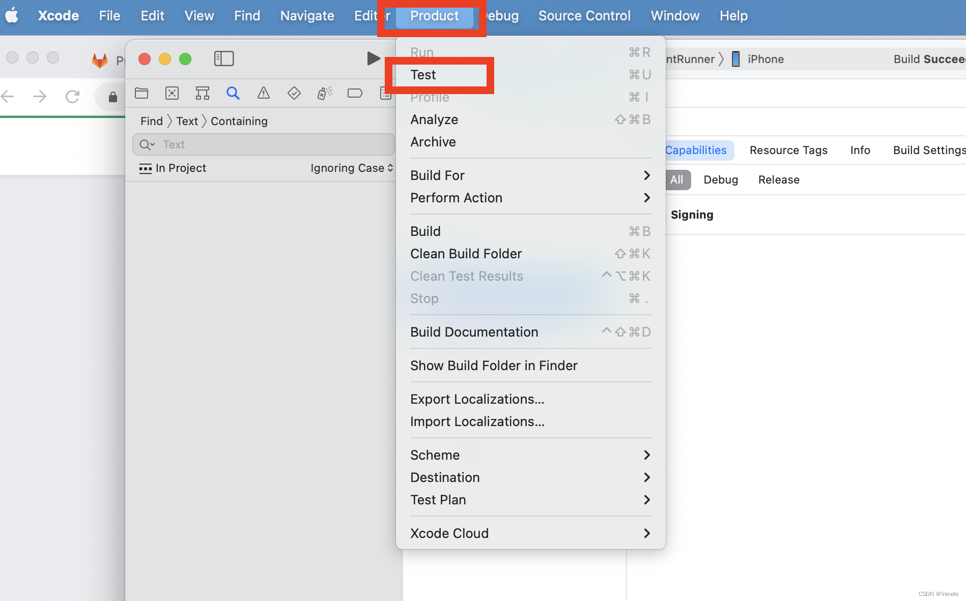 2)点击Product → 选择Test方式