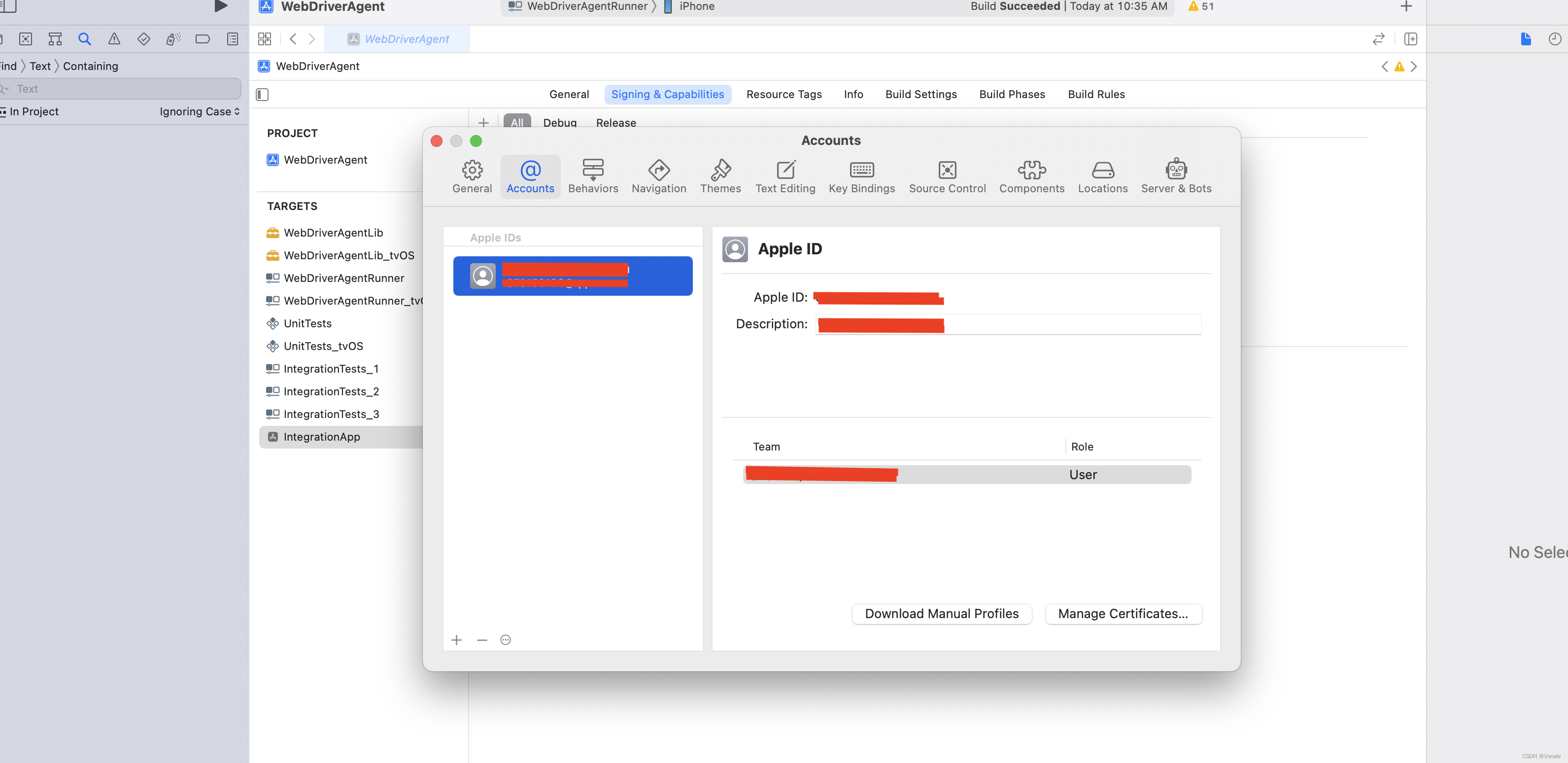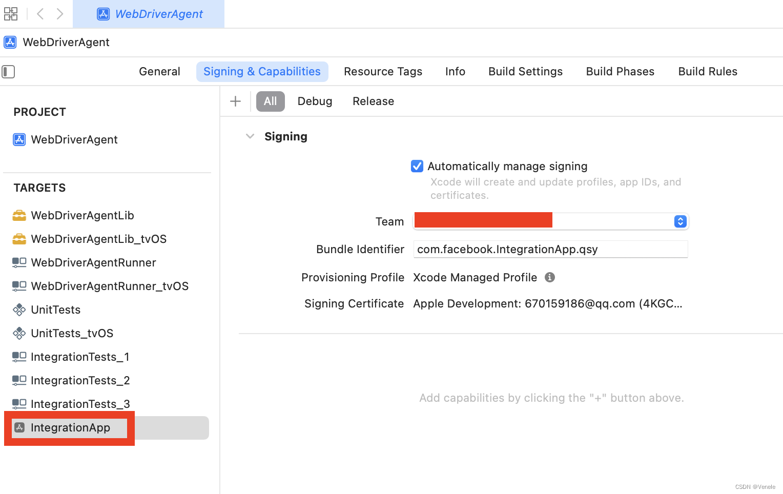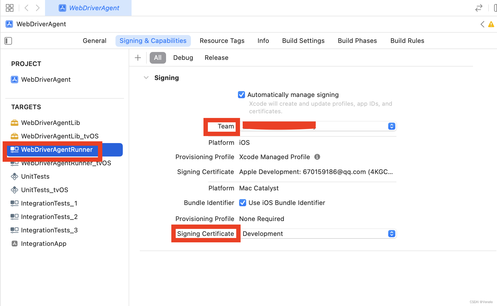 WebDriverAgentRunner,设置对应的team、certificate
