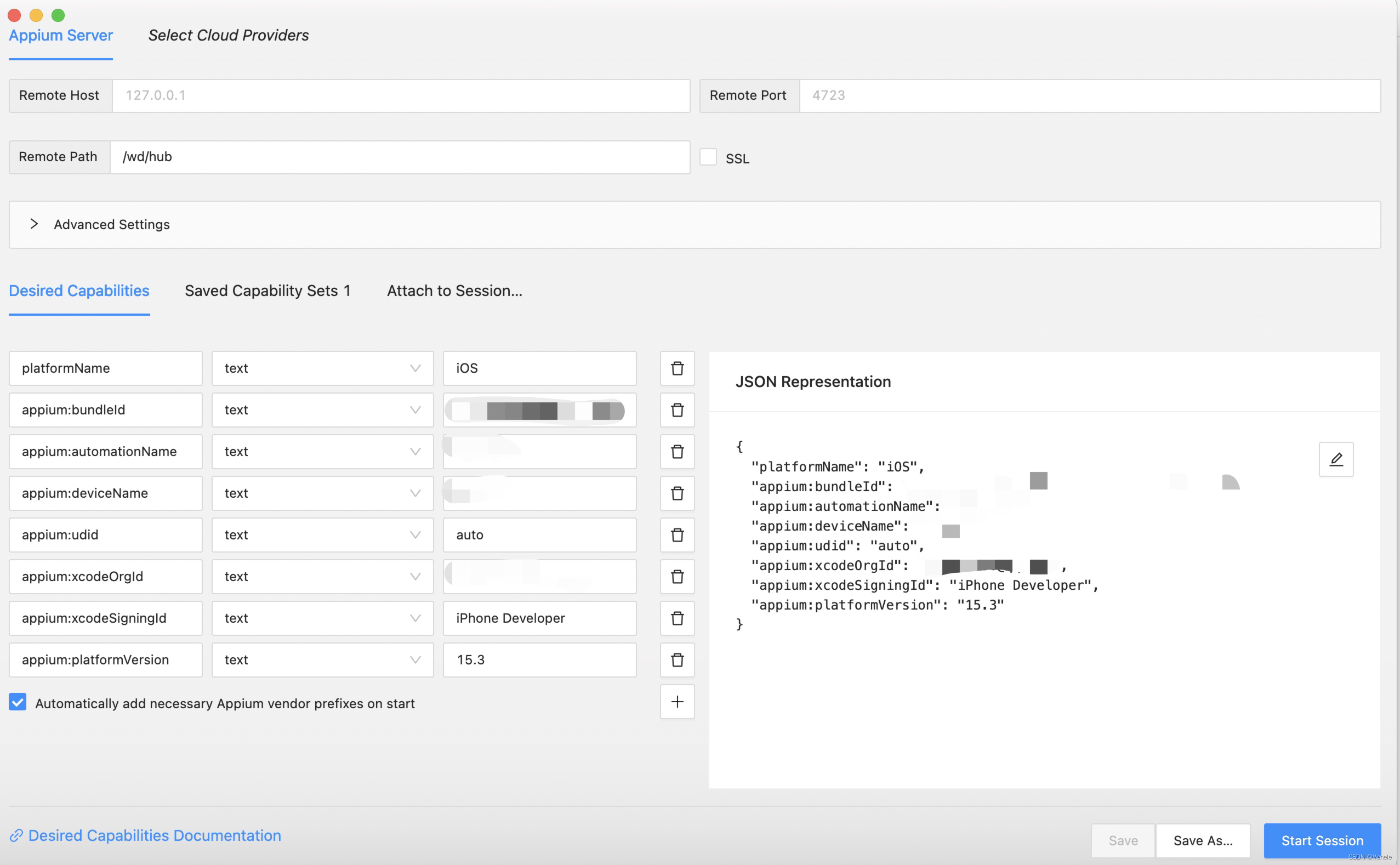 2、打开Appium Inspector,配置后点击Start Session,基本配置的参数如下: