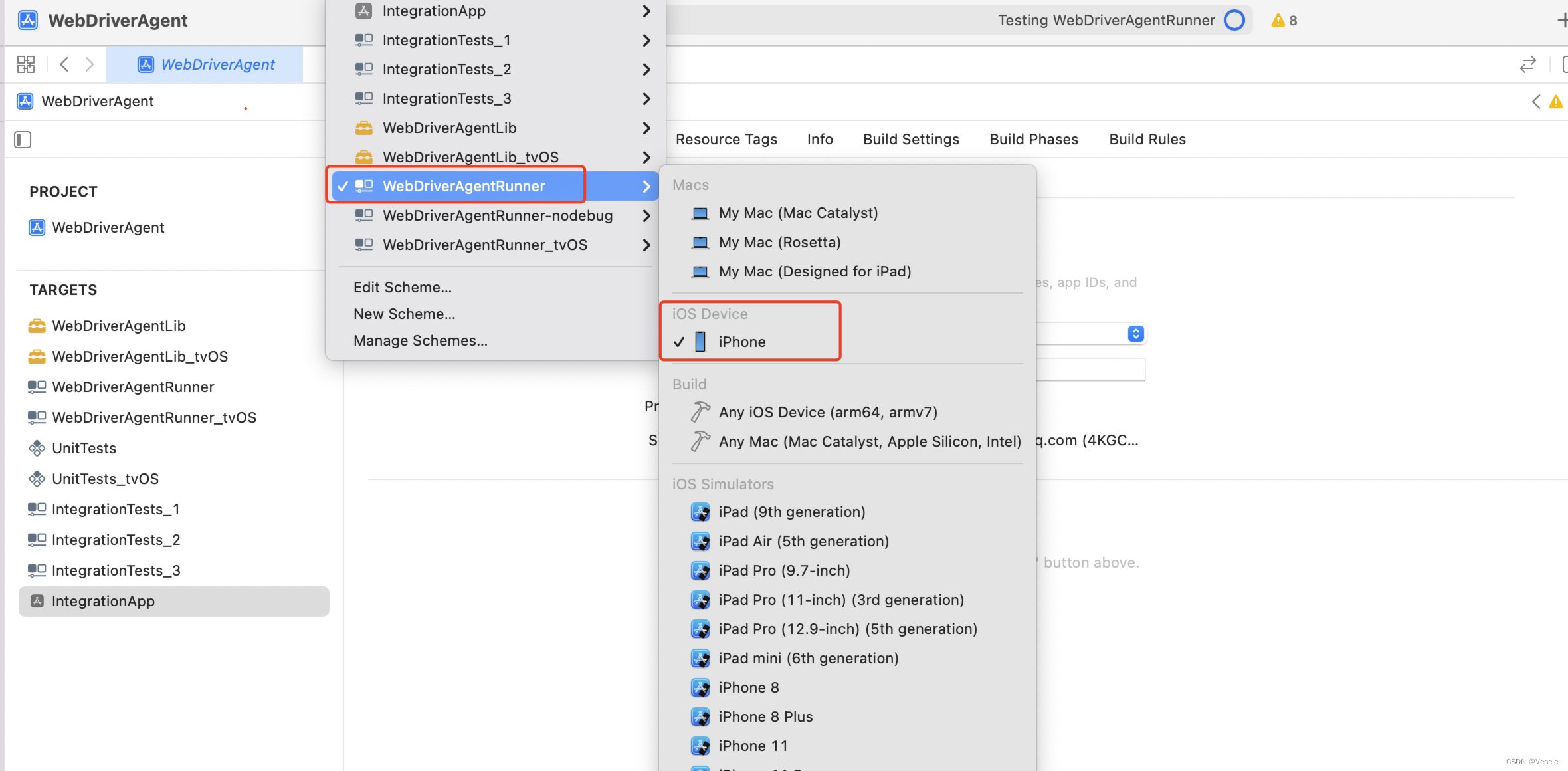 1)选择scheme为WebDriverAgentRunner ->选择运行设备,模拟器和真机都可以
