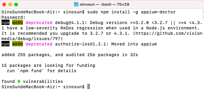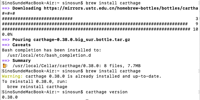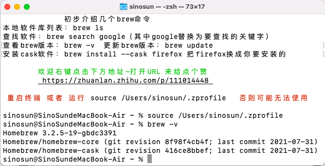 安装结束后重启终端 或者 运行 source /Users/sinosun/.bash_profile 否则可能无法使用。