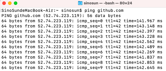 安装的Xcode自带Git程序,一般Xcode安装好后不需要再单独安装Git,验证Git环境即可。如果后面的环境依赖安装出现关于Git的报错,需要更新Git,或者卸载重新安装。验证安装:git --version验证git连接:ping github.com能够连接成功时,终端显示: