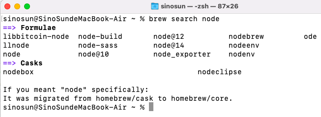 安装命令:brew install node@版本号 (会将npm和nodejs一起安装)