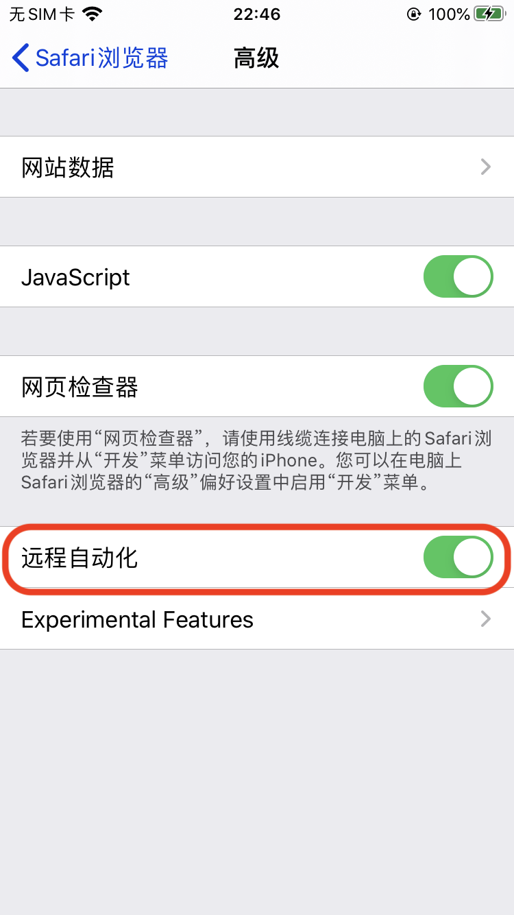 iOS手机端进入设置 --> Safari浏览器 --> 页面最下方“高级” --> 开启“远程自动化”