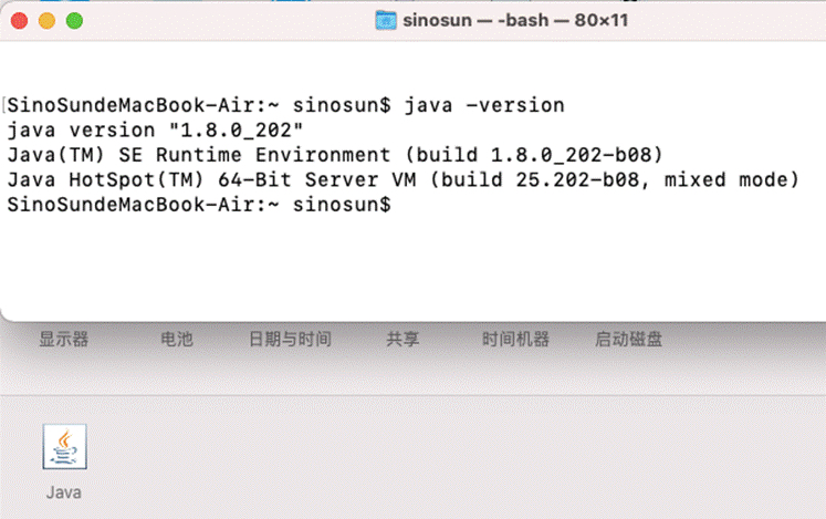 安装好后在“系统偏好设置”中会有Java图标,并且在终端中输入“java -version”后,可以验证安装版本。