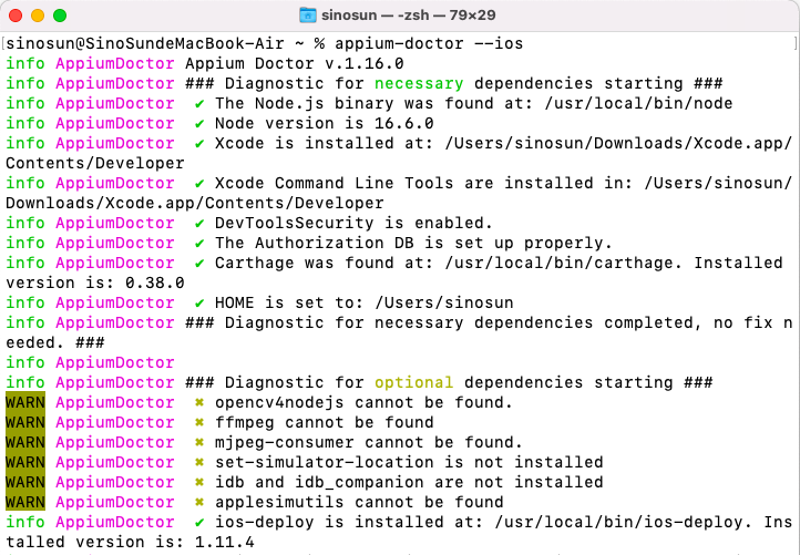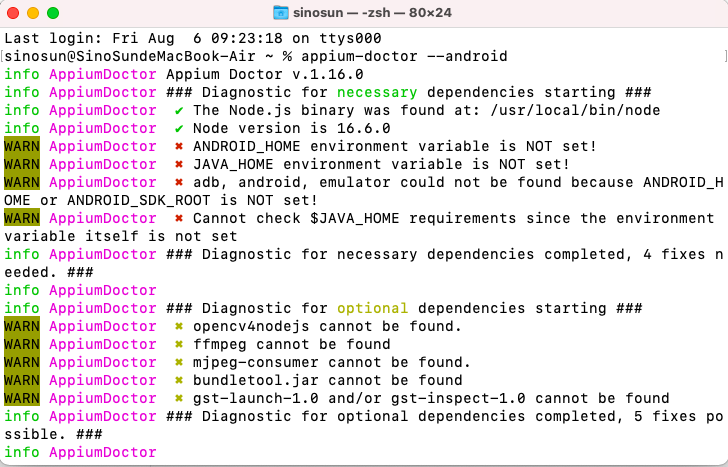 终端中输入:appium-doctor 验证下iOS自动化、Android自动化测试环境的搭建是否还有问题。只要前面所有的步骤没问题,基本不会出现环境问题。